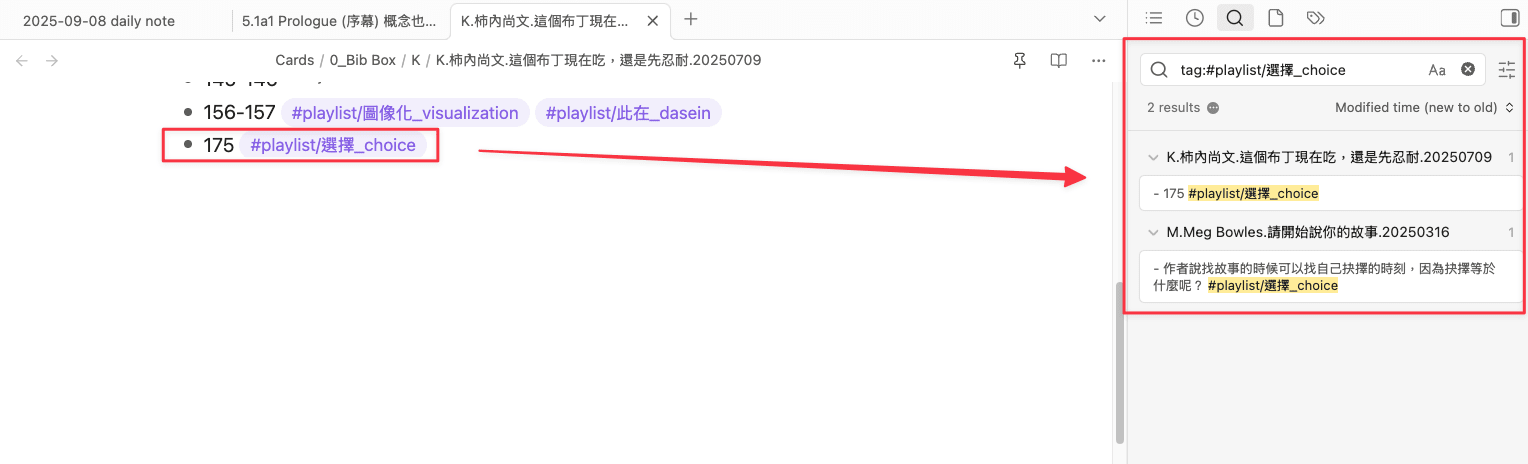 例如當我在 Obsidian 中點擊「選擇_choice」這個 Tag 時,右側會跳出所有層標記過的這個 Tag 的筆記段落: