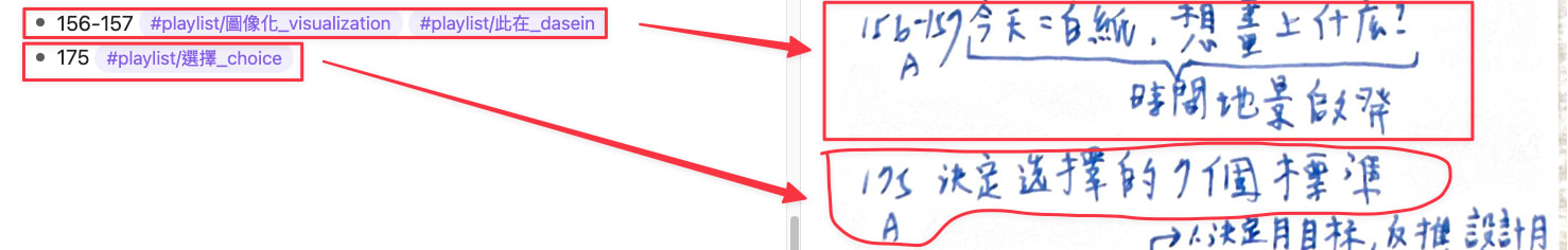 以圖片上的範例來說,我就能知道其實《請開始說你的故事》 這本書中,也有一個段落在講「選擇_choice」這個關鍵字。這個 Tag 系統就會產生有意思的創意連結: