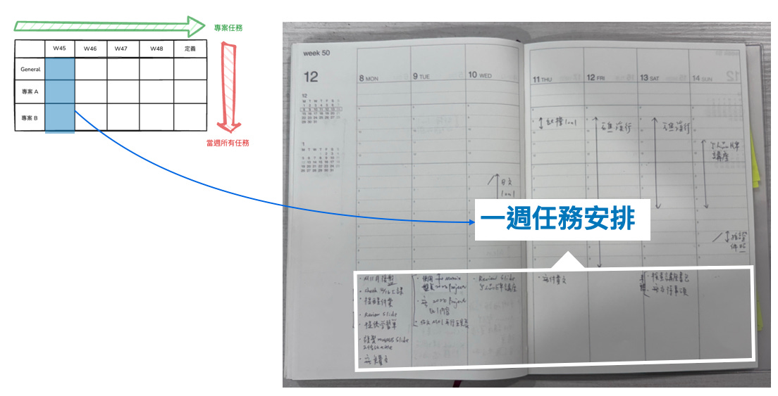 周任務是我每天都要看好幾次的內容。如果放在手機或電腦上,很容易被其他訊息打斷。紙本手帳就像一個「純淨的工作空間」,翻開就是一週的任務預覽。