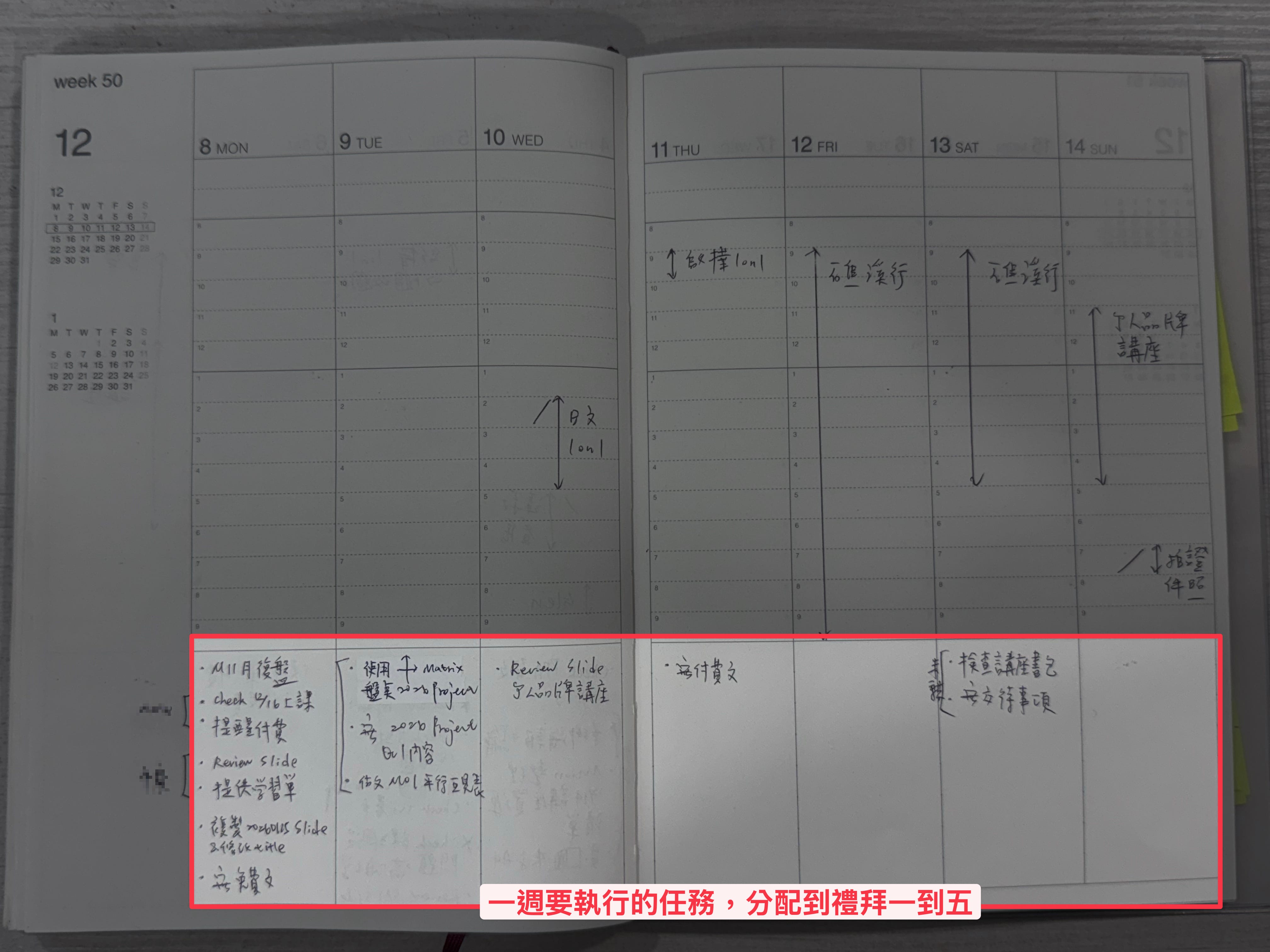 以前我都是直接把「想做的任務」塞進手帳,沒有先確認固定行程。