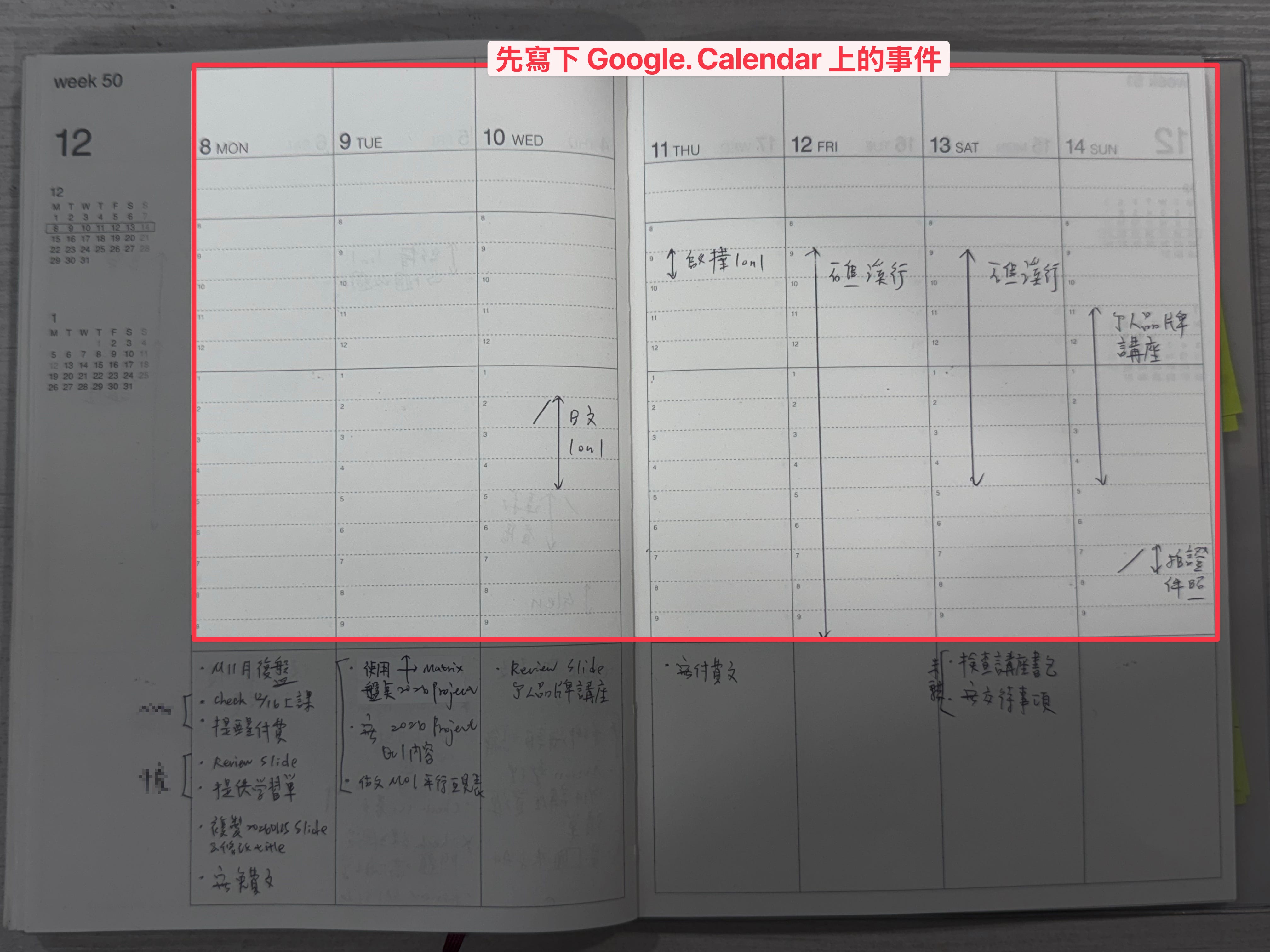 - 步驟 1:先在手帳填下週「已確定」的行程,避免時間重疊