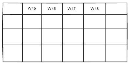 假設現在是 2025 年 11 月,你打開 Google Sheet 後在第一列(最上面那一排)寫上週數。11 月通常會有 4 到 5 週,所以你會寫:W45、W46、W47、W48。
