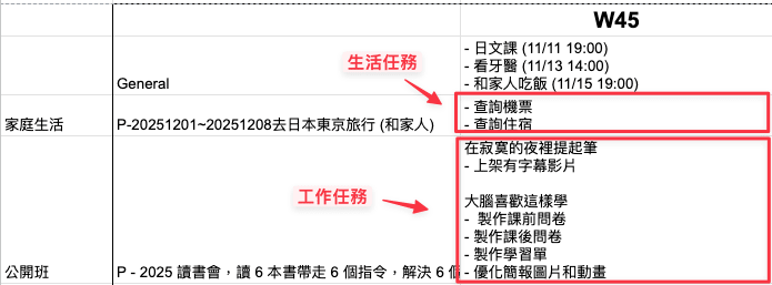 如果你剛排好 W45,你已經知道某些任務會在更後面的週進行… 也可以先預排到 W46、W47。